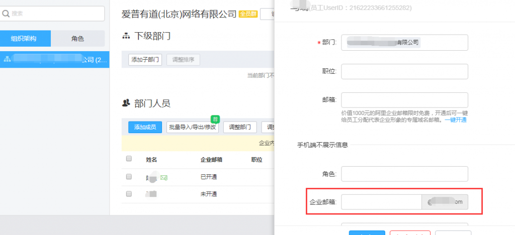 一、 点击“管理员工邮箱”,跳转到“通讯录”后,点击成员姓名,为其分配邮箱账号(在钉钉后台这里分配的邮箱地址要和企业邮箱后台分配的邮箱地址一致)