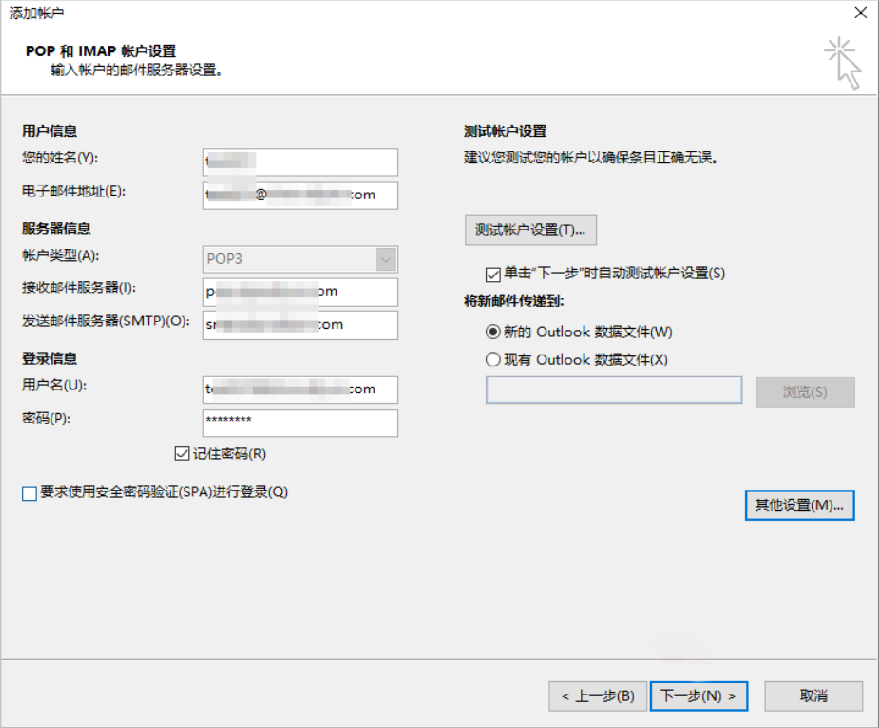- 填写用户信息、服务器信息、登录信息,填写完成后单击其他设置。下图以填写POP3协议为例。