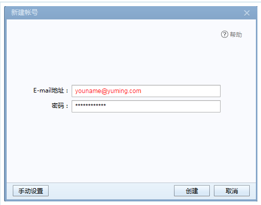 填入完整的邮箱地址:youname@yuming.com、密码,并单击左下角手动设置按钮。