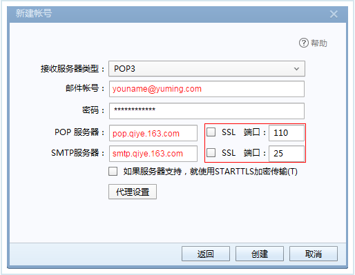 不勾选“SSL”时,端口号:110;