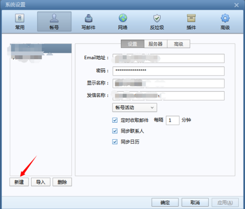 2.打开如上所述的设置栏目后,就如显示图二所示界面,我们只要在腾讯企业邮箱客户端设置界面点击账号,单击新建,就可以进入下一步操作;