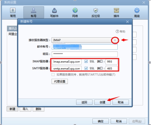 4.接受服务器类型可以单击选择pop3协议或者imap协议,一般建议使用imap协议,可以同步客户端与网页端的所有邮件。再设置服务器地址,腾讯企业邮箱imap协议服务器地址为:imap.exmail.qq.com,pop3协议服务器地址为:pop3.exmail.qq.com,smtp协议地址为:smtp..exmail.qq.com;SSL选项可勾选可不勾选,后面的端口都会自动识别。完成以上操作后点击创建即可。