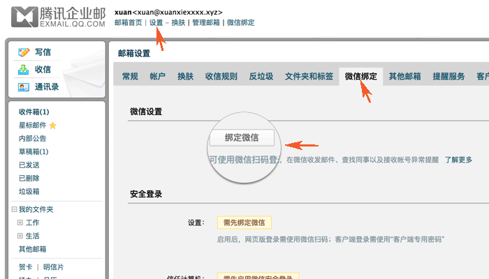 第一步:绑定微信号,企业成员登录邮箱后,进入“设置”-“微信绑定”-“微信设置”,点击“绑定微信”。打开微信使用“扫一扫”扫描此二维码。在微信上点击【确定】即可完成绑定。