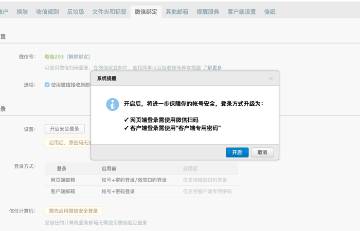 点击【开启安全登录】之后,会提示开启后的登录方式:开启后登录网页端只能通过微信扫码,客户端需使用“客户端专用密码”登录。