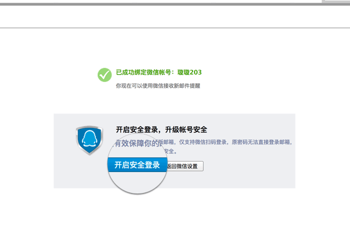 第二步:开启安全登陆,完成绑定后,可以选择是否开启“安全登录”设置(下面第一个图),你后续也可以在“设置”-“微信绑定”-“安全登录”中开启(下面第二个图)。