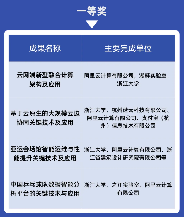 同时,阿里云共同完成的「基于云原生的大规模云边协同关键技术及应用」、「中国乒乓球队数据智能分析平台的关键技术与应用」、「亚运会场馆智能运维与性能提升关键技术及应用」等也荣获浙江省科技进步一等奖。