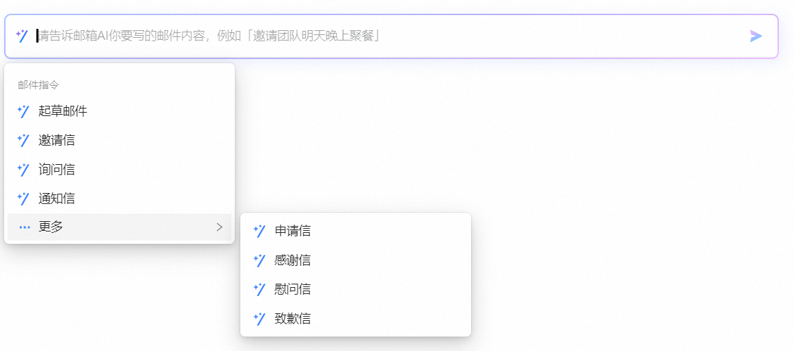 1、邮箱AI提供了多种常见场景的邮件指令。