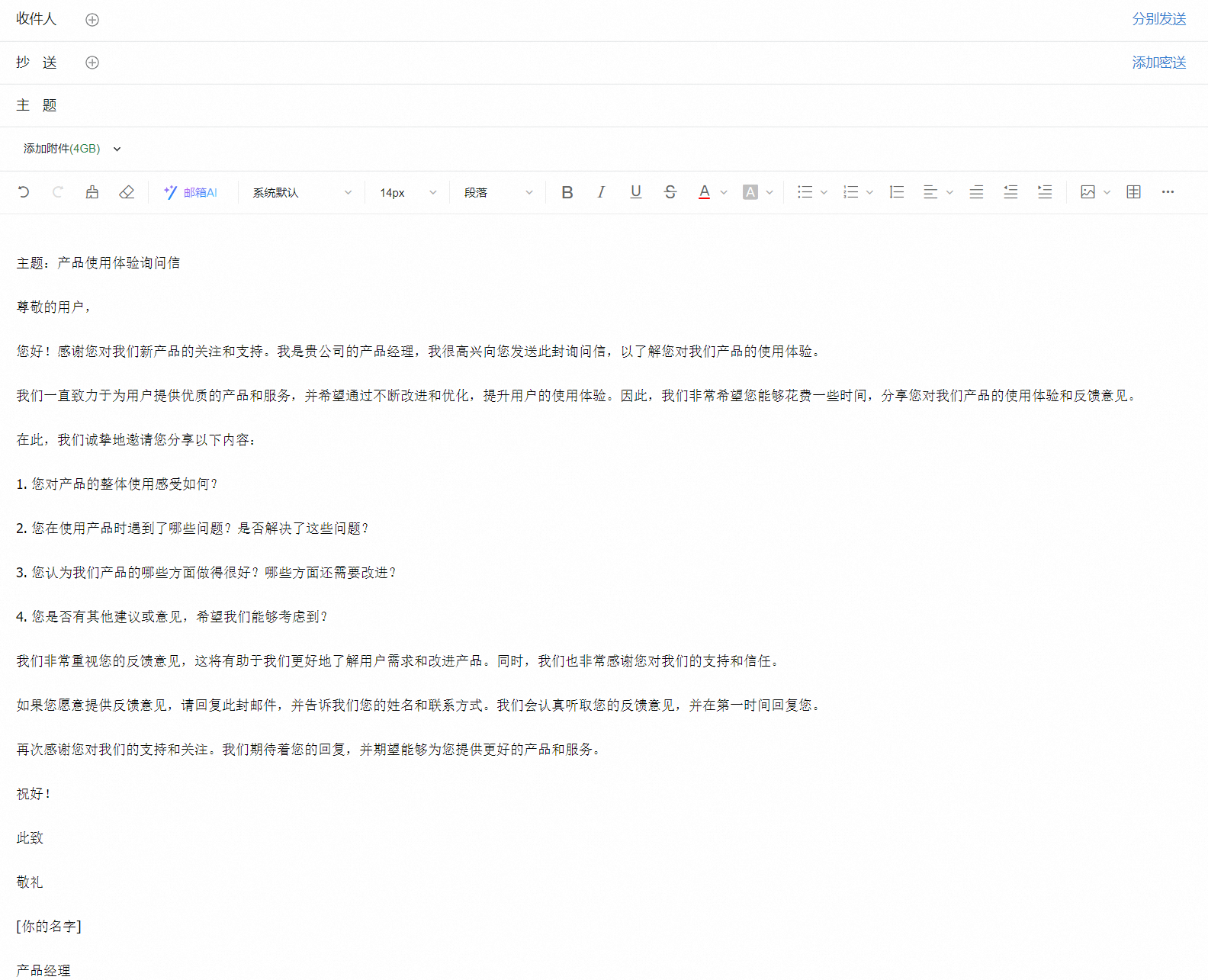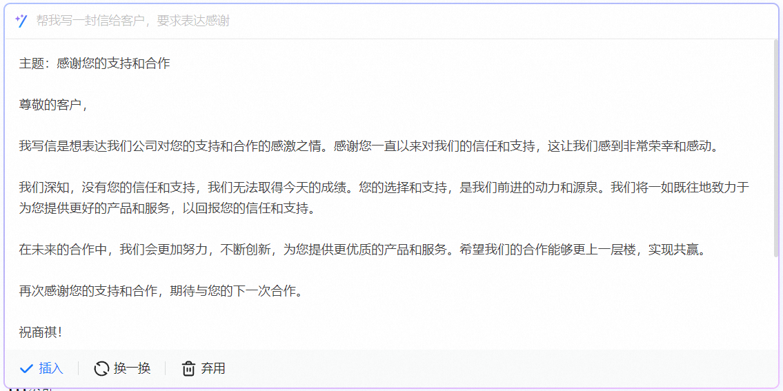 邮箱AI是智能化的企业邮箱写信功能,它利用自然语言处理技术,在撰写邮件正文时,可以为你提供一些写作建议。它能够生成某些常见场景的邮件,如询问信、感谢信等,也可以自定义需求,生成邮件内容。