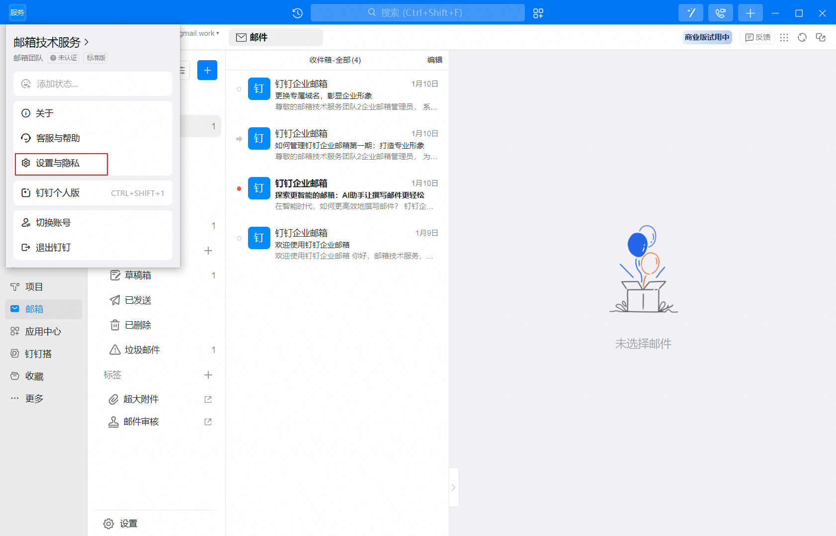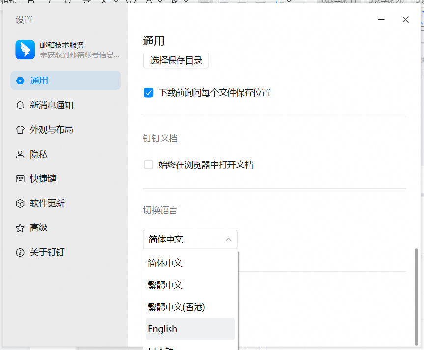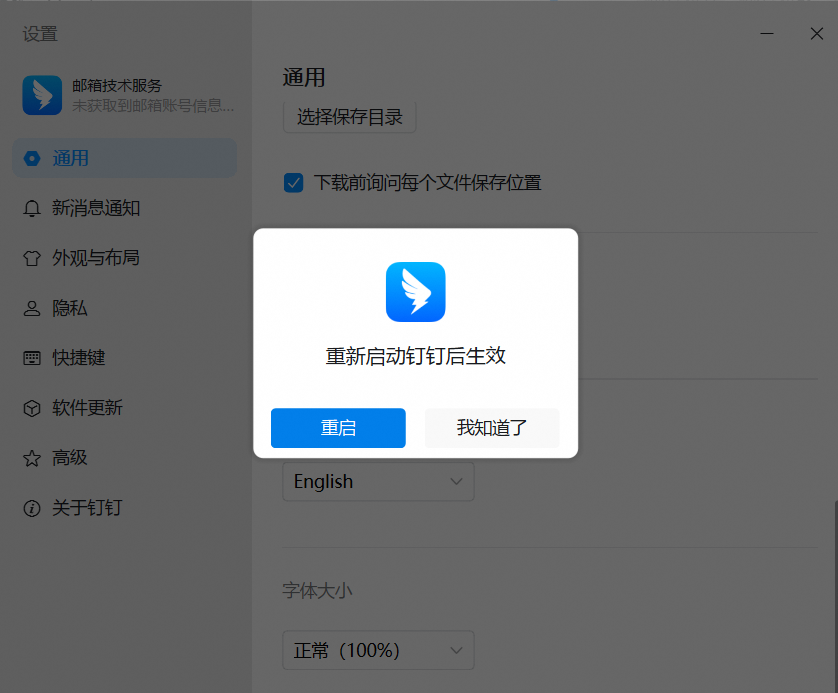 钉钉企业邮箱与钉钉深度集成,语言跟随钉钉客户端自动适应。若需要切换钉钉企业邮箱语言,在钉钉设置里切换钉钉设置即可。操作步骤1、单击头像,单击设置与隐私2、在通用菜单下,向下滚动,在切换语言中,选择需要的语言,如”English“。3、点击重启,让新语言生效。4、效果展示。