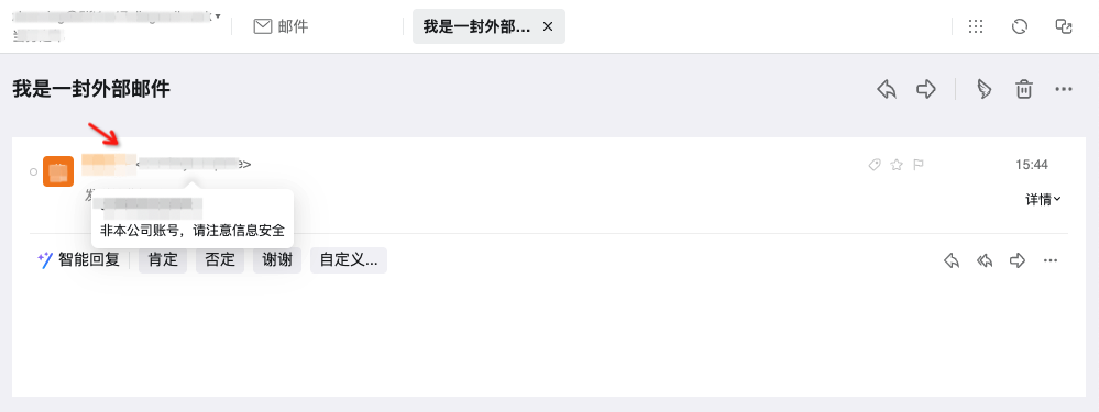 2、经过确认,发件人本人未发过该邮件,且发件人邮箱也不存在被盗用的情况,那么,可能是不法分子使用了伪造发件人身份的方式发送的误导邮件。如果需要判断是否为伪造发件人的邮件,可以在钉钉企业邮箱中将光标移至发件人账号位置,如果是被伪造的邮件,则发件人显示栏会出现类似A代表B的标记,则说明是由A代表B发来的邮件。