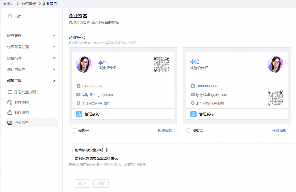 2、可选择多个模板,模板将会展示在员工签名档设置中。