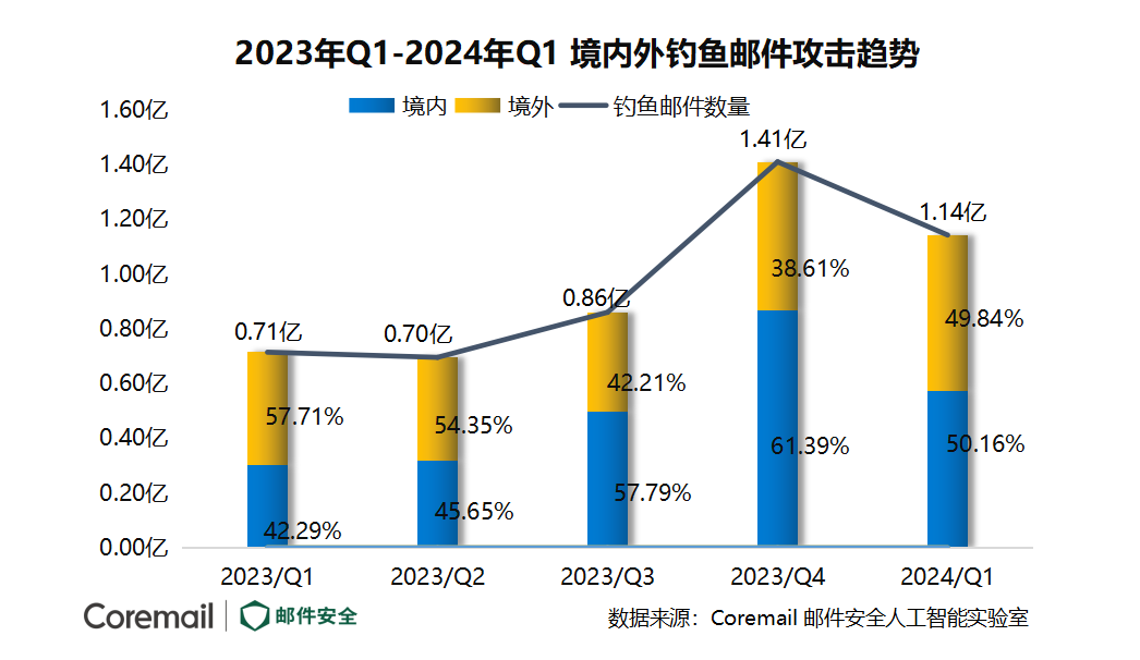 2024年Q1企业邮箱安全性研究报告:钓鱼邮件同比增长59.9%