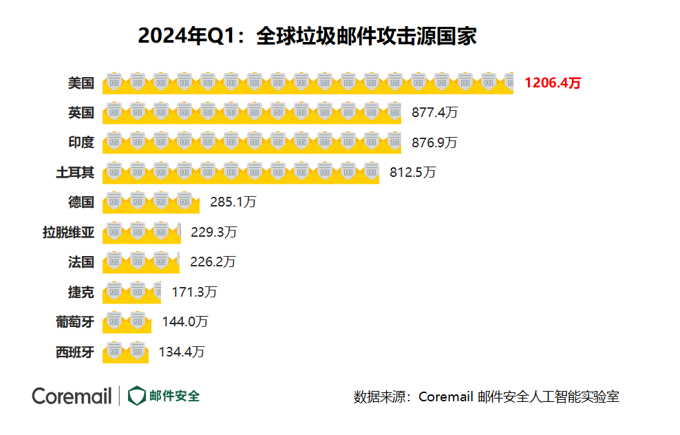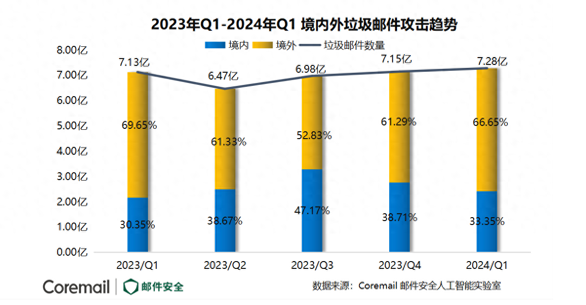 根据Coremail邮件安全人工智能实验室最新数据显示,2024年第一季度,国内企业邮箱用户收到的垃圾邮件数量继续增长至7.28亿封。境外垃圾邮件攻击激增,超过三分之二的垃圾邮件来自境外。