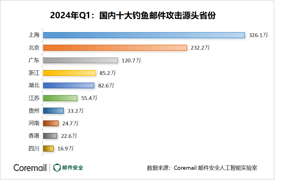 值得关注的是,在国内的钓鱼邮件攻击态势中,上海首次超过北京成为了钓鱼邮件攻击的主要来源,其数量远远超过其他省份,达到了326.1万次。广东、浙江、湖北、江苏、贵州、河南、香港以及四川地区也在榜单中,成为了钓鱼邮件黑客攻击的活跃来源。