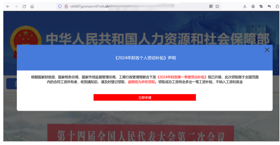 hxxp://xxxxxxxxnnzwrv97rofs.xxxxx.top”,其目的是诱导用户输入身份证号、银行卡号、银行预留手机号、支付密码等个人敏感信息。