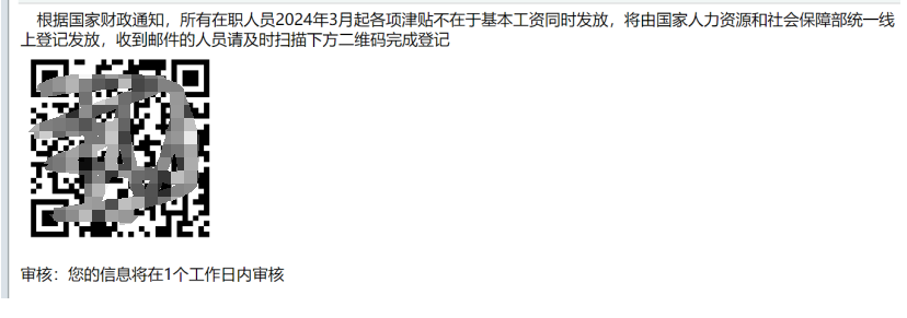 邮件正文中的内容主要是诱导收件人扫描正文中的二维码。钓鱼网址由hxxp://wap.xxxx.org跳转至“hxxp://xxxxx.xxxx.top”,其目的是获取用户的身份证号、银行卡号、银行预留手机号、支付密码等个人敏感信息。