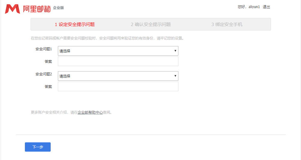 首次登录的阿里云账户,需要进行邮箱安全设置。包括“安全提示问题”和“绑定安全手机”。