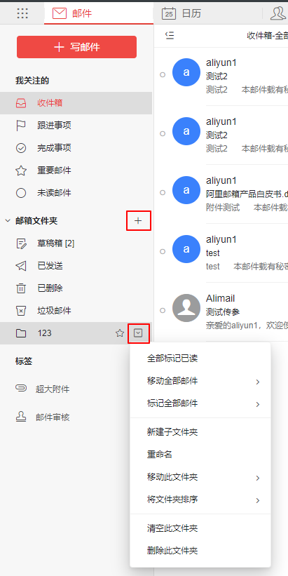 新建文件夹:阿里云邮箱系统支持文件夹多级嵌套创建,您在文件夹下可继续创建自定义的子文件夹。您在创建新的子文件夹时须需在原文件夹的位置上。点击新建子文件夹名字即可。