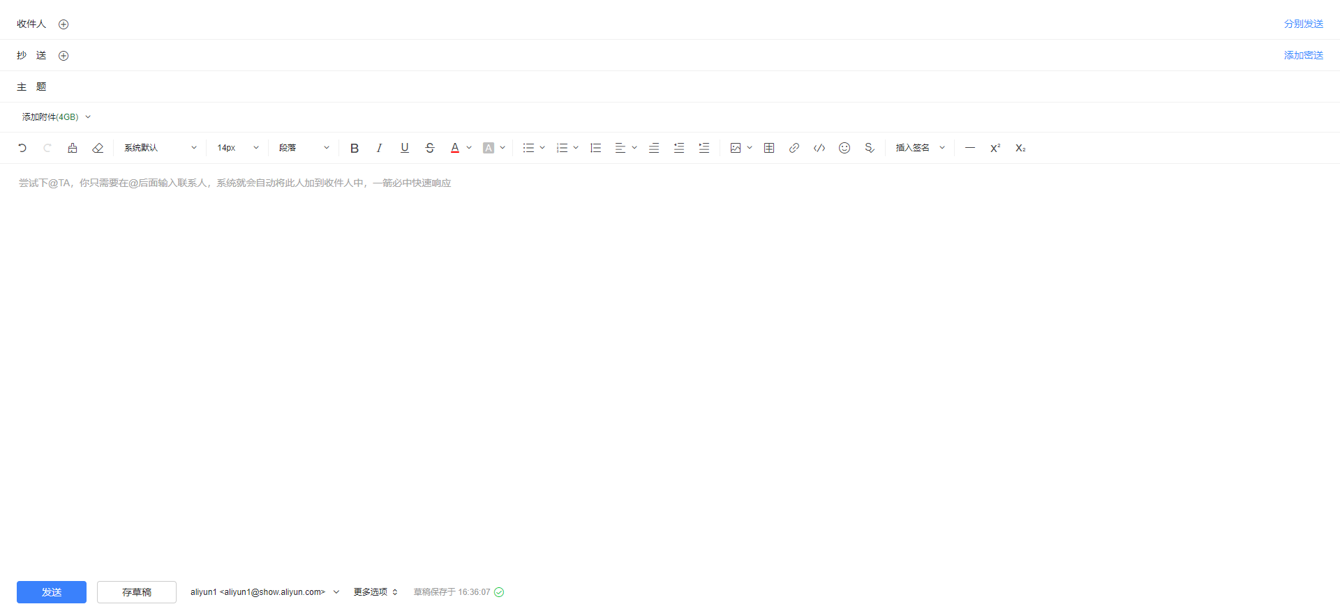 阿里云邮箱 5.0是阿里云最新版本的邮件系统,其5.0风格的Webmail界面应用相比以前的版本来说更具有简约大方,操作便捷等特点。