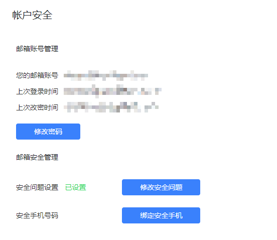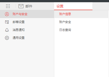 邮箱设置功能,包括“账户与安全”、“邮箱设置”、“消息通知”和“通用设置”,下拉箭头为快捷设置。