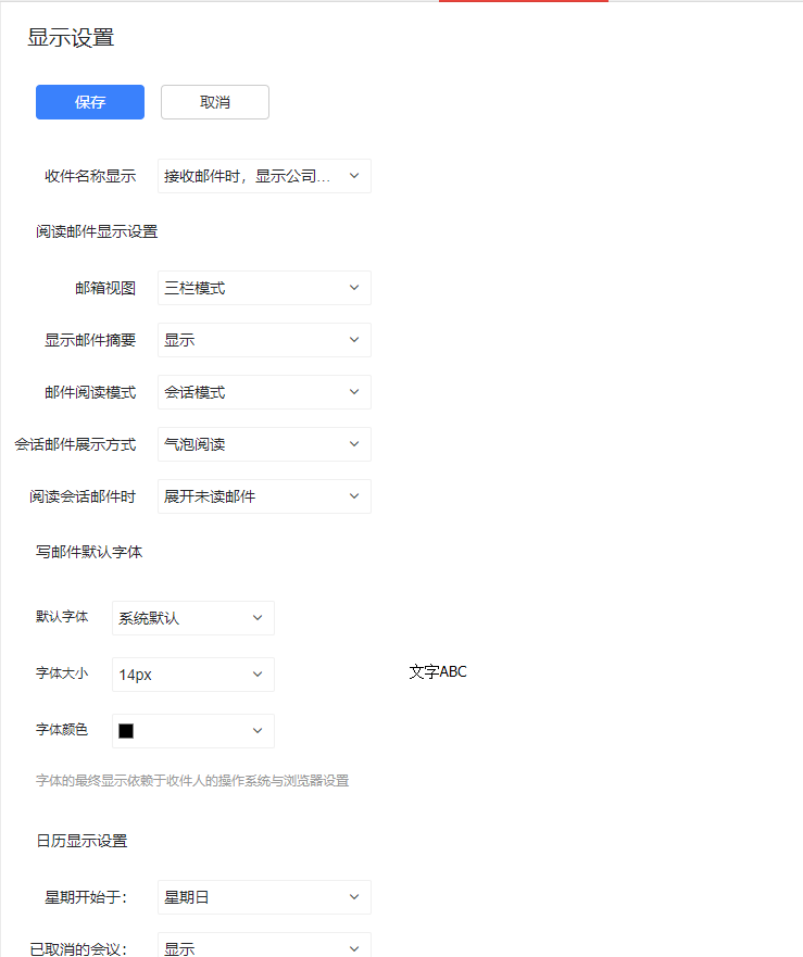 可以对日历功能的显示进行设置。包含 开始星期、是否显示已取消会议和是否显示农历。