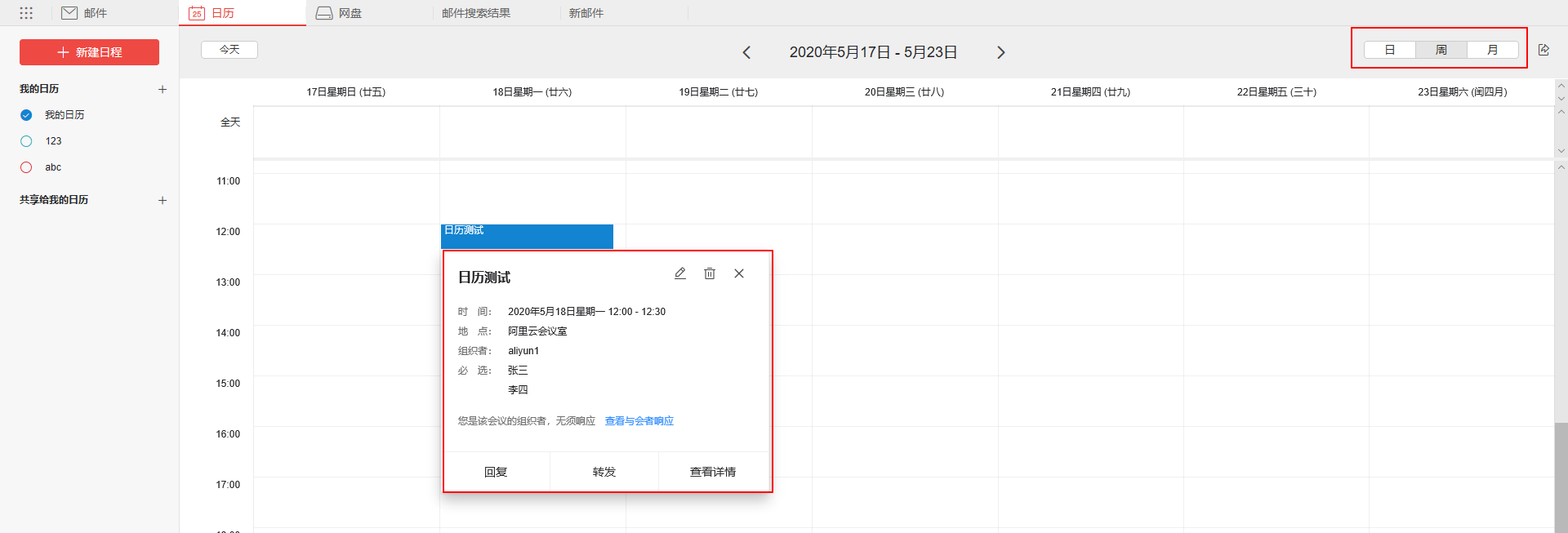 日程创建以后,可以在日历页面直接查看,查看状态为会议主题与内容、参会者、回复、状态以及详情。右上角可根据日、周、月不同状态进行查看。
