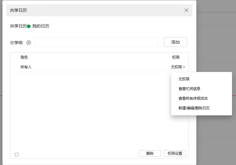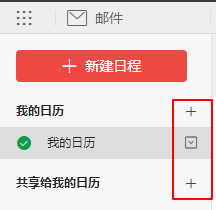 共享日历:点击日历右侧下拉箭头,可以看到新建日程和共享日历功能,可以将日历共享给他人。并赋予权限