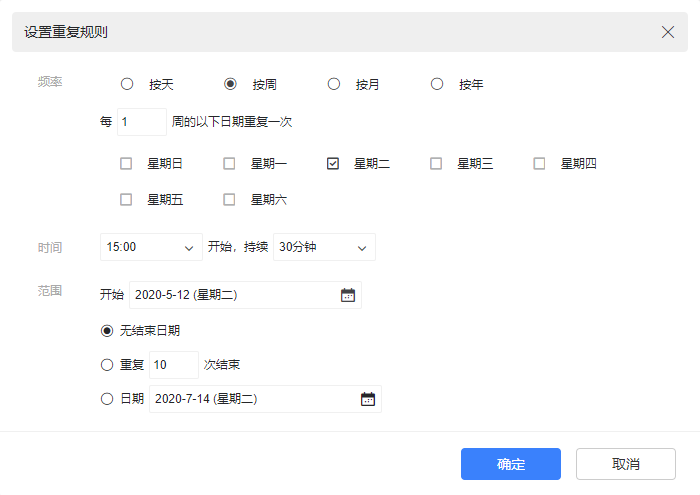 点击“设置重复规则”,可以针对此会议进行重复设置,按照重复条件进行固定发信,通知参会者。