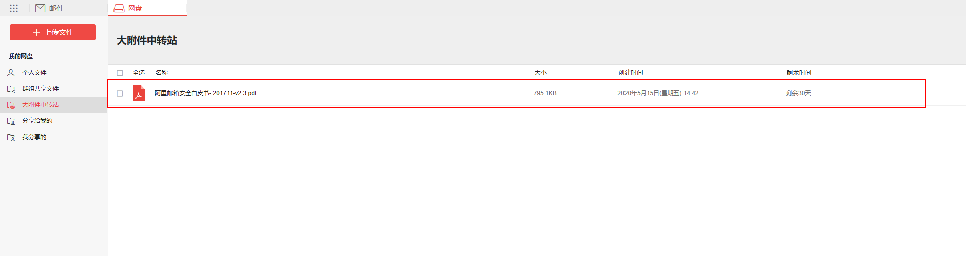 大附件中转站:发送的超大附件都会被存放于此,也可以进行自助上传文件,可以查看上传时间、目录、到期时间。超过到期时间,该文件将会被删除。