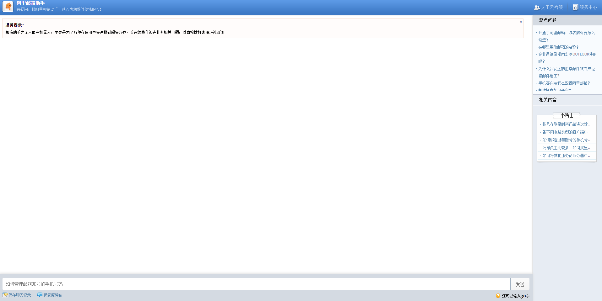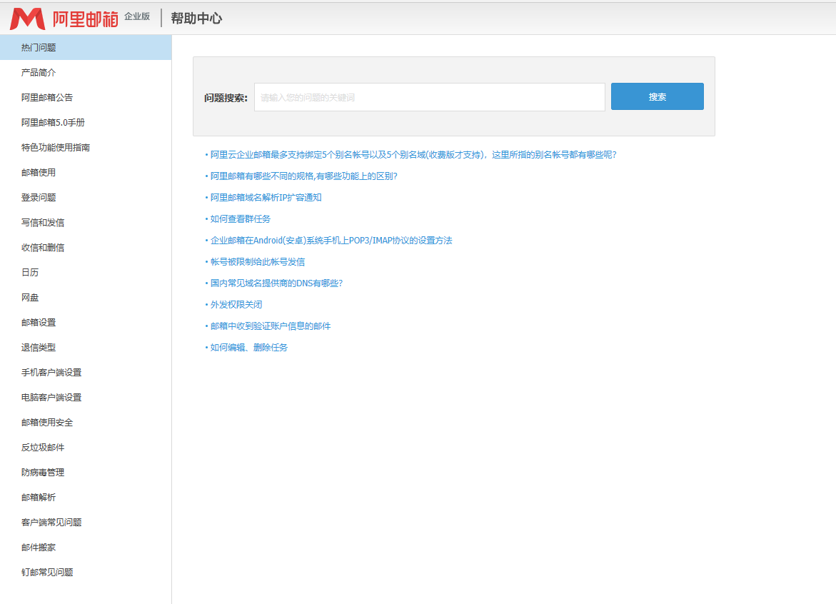 阿里云邮件系统提供了详细的在线使用帮助信息和智能机器人。用户可以从帮助中心获得多种功能相关的常见问题解决方法。
