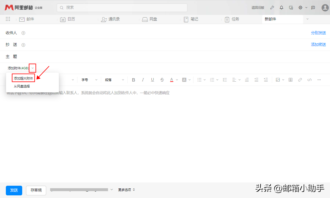超大附件:写邮件页面点击添加附件】 右边的下拉按钮,通过下拉框选择【添加超大附件】按钮,选择文件上传即可(如下图所示);